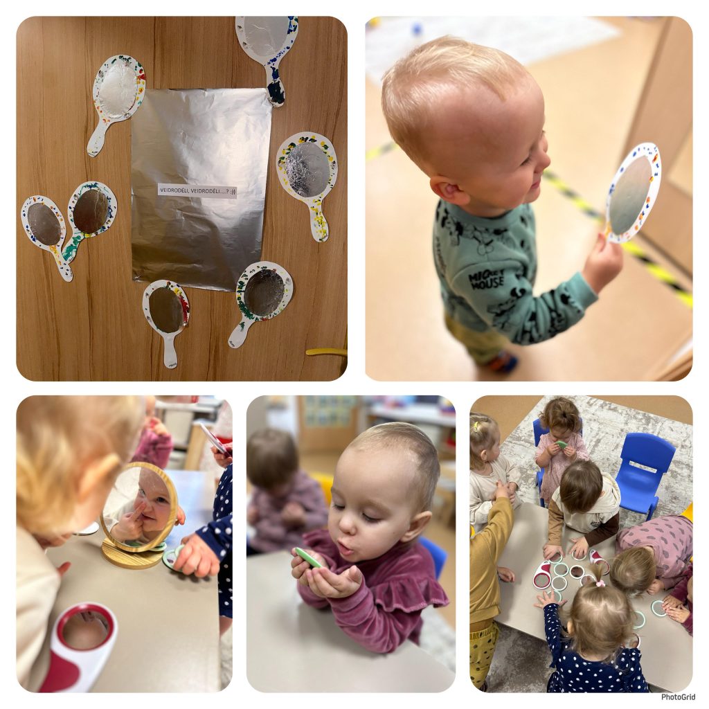 Pirmos grupės vaikai su mokytoja Sintija, šią savaitę nagrinėja temą : ,,AŠ” ATSPINDŽIAI, todėl į pagalbą pasitelkė veidrodėlius. Mažieji tyrinėjo save atspindyje, darė įvairias veido mimikas, mokėsi pavadinti savo kūno dalis. Pastatytame inde su šiltu vandeniu, vaikai bandė panardinti ranką ir stebėjo, ar pakito forma, ar ne. Kūrybinės veiklos metu mažieji dailininkai pasidarė savo veidrodį ir žiūrėdami į jį, išsikėlė klausimą – ,,Kas pasaulyje gražiausias/gražiausia”?