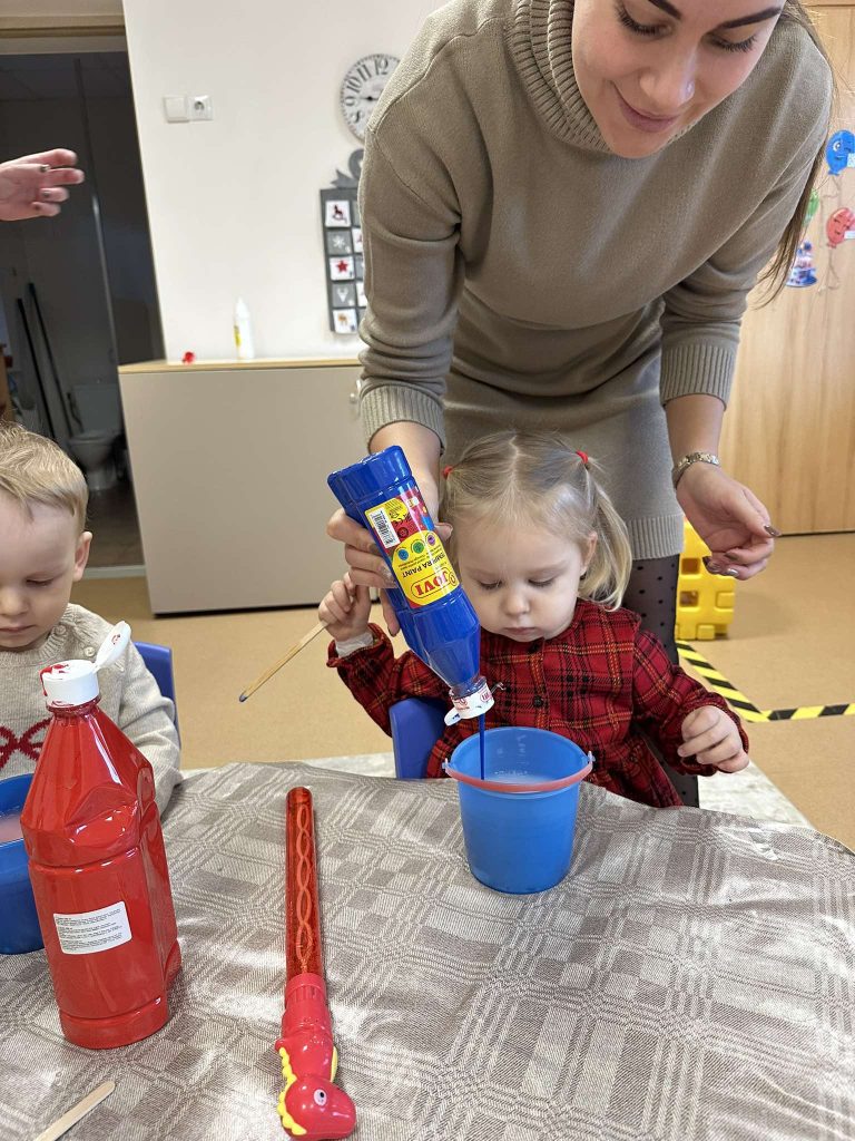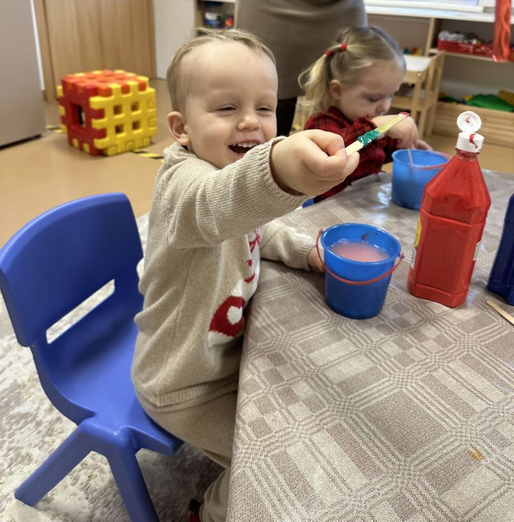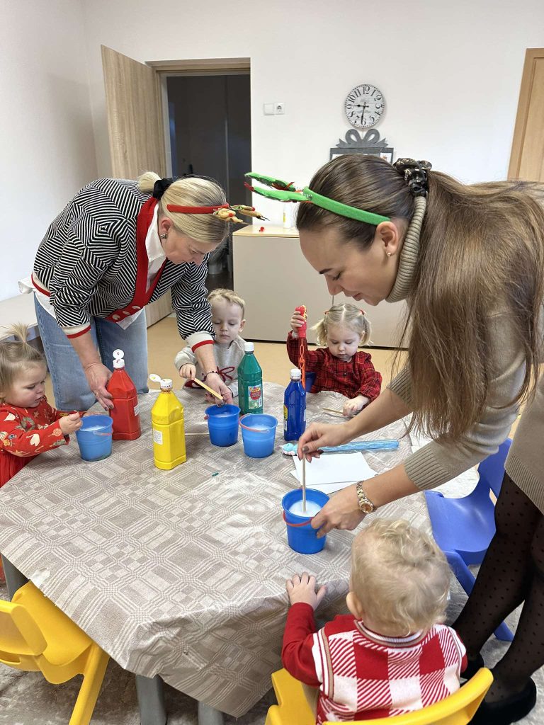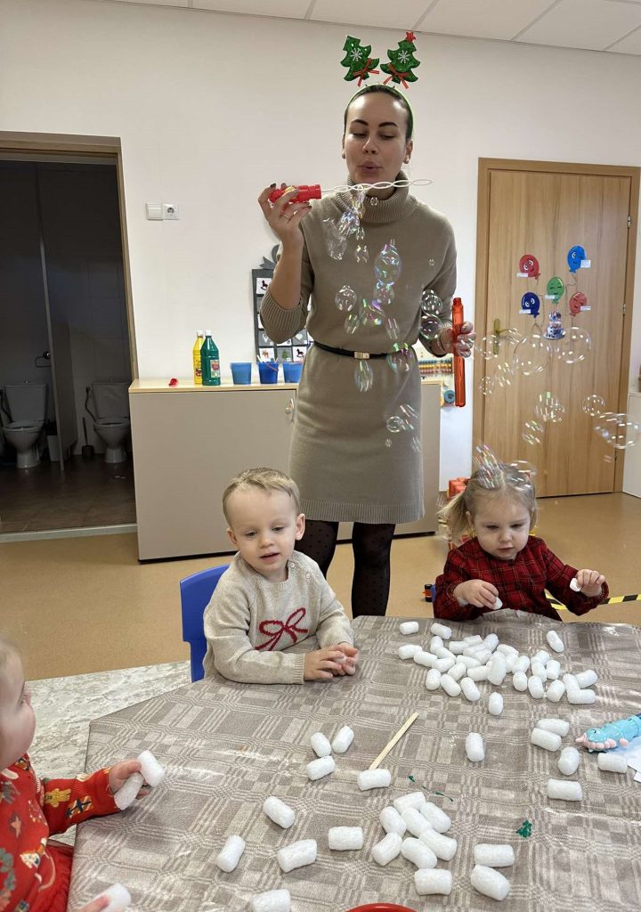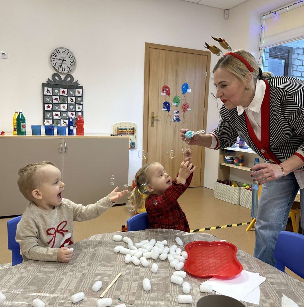 Patys mažiausieji mūsų ugdytinai kartu su mokytojomis Sintija ir Loreta Kalėdinį rytmetį praleido neįprastai: pūtė muilo burbulus, gamino sniegą, maišė dažus ir kūrė paveikslus. Ši veikla skatino išreikšti savo kūrybiškumą ir džiaugsmą. Rytmetis buvo kupinas šypsenų, juoko, šilumos ir, aišku, dovanų.