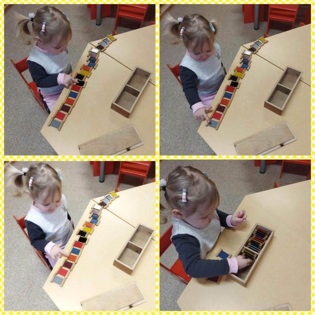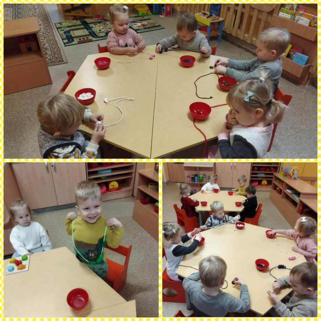 „Pabiručių“ 2 gr. (2-3m.) vaikai geba trumpam susikaupti, veriant karolius bei priemonės pagalba ieškant spalvai poros. Vaikams pavyksta skirti ir pavadinti spalvas grupės aplinkoje.
