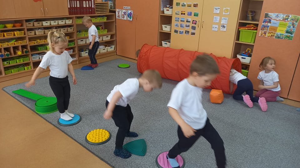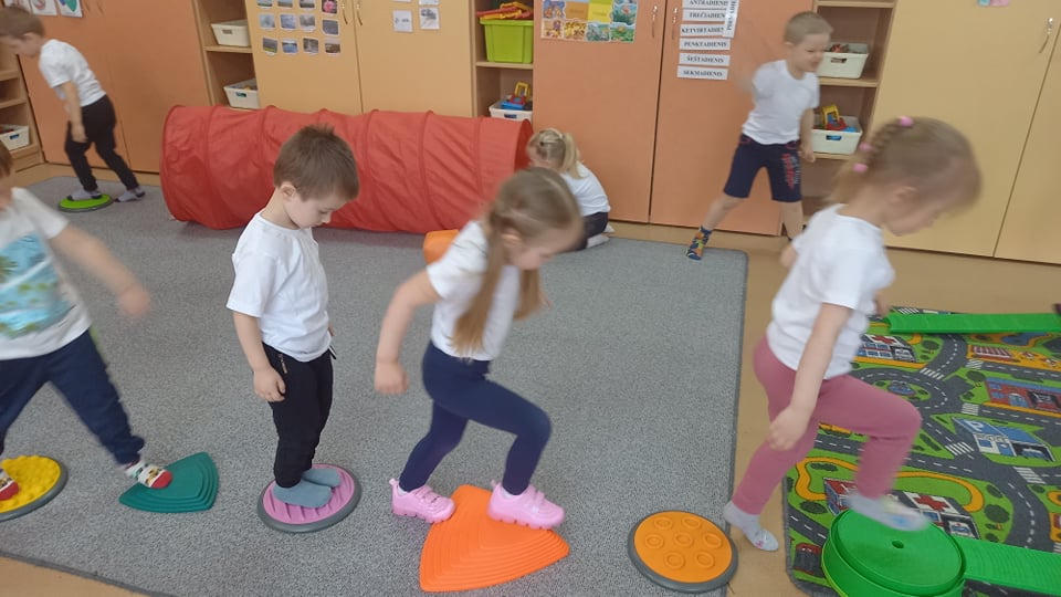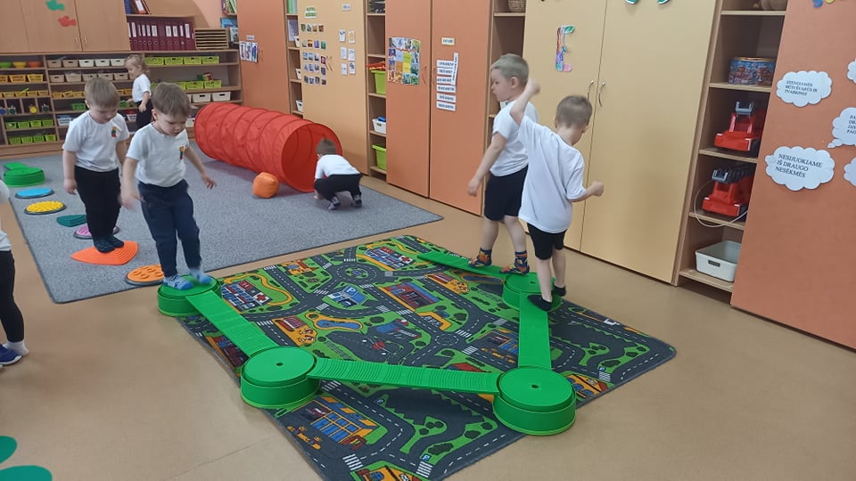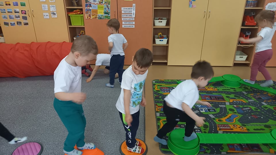 Už lango lyja-tai „Čiauškučiai” sportuoja grupėje. Veiklos metu vaikai pažįsta skirtingą sporto inventorių ir atranda sau mieliausią.
