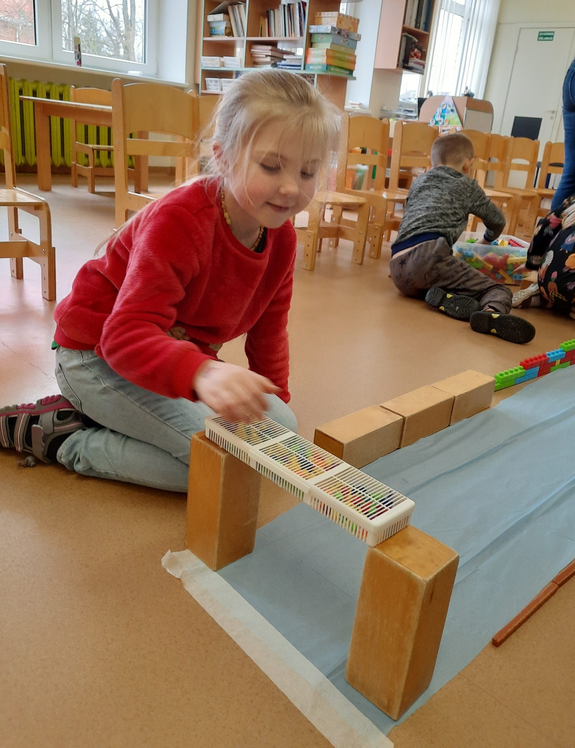 Vaikai tarėsi, diskutavo, aiškinosi, kaip galima pasiekti kitą upelio krantą ir nusprendė, kad reikia tilto. Apžiūrėjo įvairių tiltų nuotraukas, sužinojo jų dalis ir pavadinimus. Mažieji „inžinieriai”, naudodami įvairiausius grupėje esančius daiktus, konstravo tiltus, išbandė jų tvirtumą, stabilumą. Atsirado siaurų, plačių, pakeliamų, siūbuojančių ir daug kitokių tiltų. „Smalsučiai” dirbo komandomis ir individualiai, vieni noriai išbandė tiltus važinėdami mašinėlėmis, traukinukais, kiti „upelyje apgyvendino” pieštus vandens gyvūnus. Veiklos metu „Smalsučių” patyrė atradimo džiaugsmą, stiprino pasitikėjimą savimi.