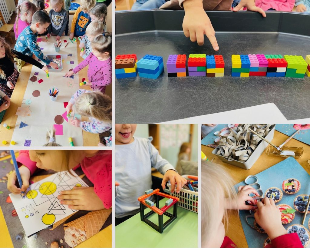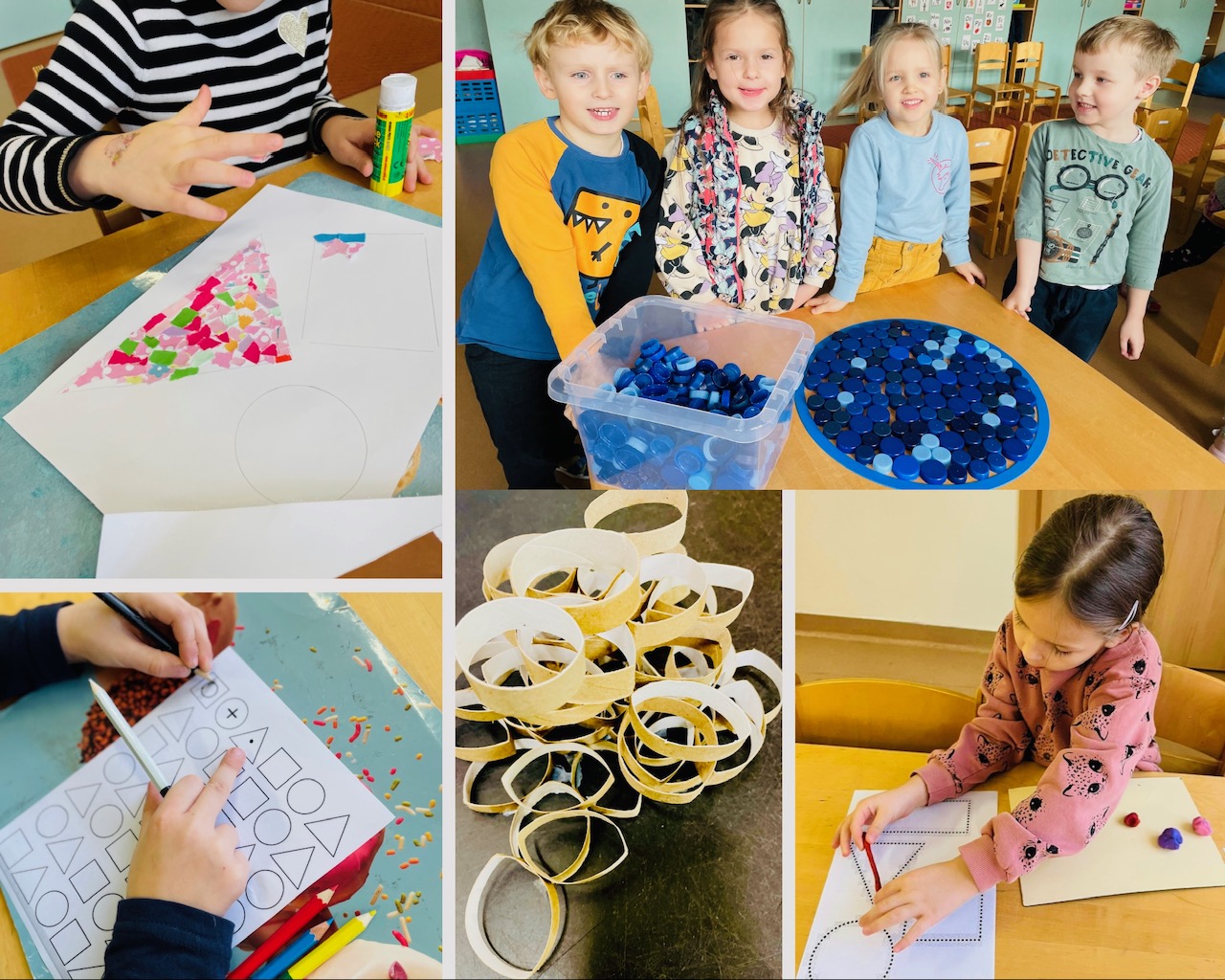 5 grupės ugdytiniai kartu su mokytojomis ,,keliavo” po geometrinių figūrų pasaulį ir aptarė, kokias figūras jau pažįsta. Sužinojo, kad yra plokščios ir erdvinės figūros, jas lygino, skaičiavo jų kampus ir kraštines. Atliko įvairias užduotėles. Iš antrinių žaliavų kūrė figūrų kilimą, dėliones ir skulptūras. Žaisdami išmoko naujų figūrų pavadinimus. Žaidimas ne tik pramoga, bet ir vaiko ugdymas.