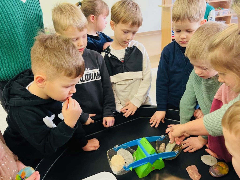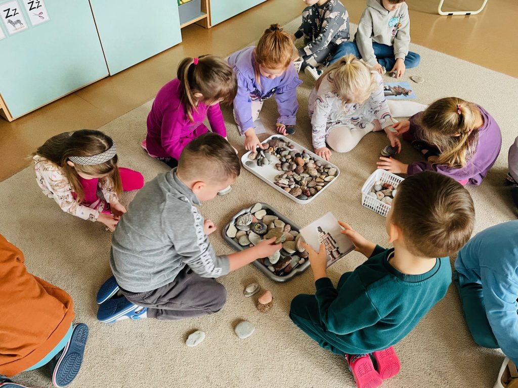 5 grupės ugdytiniai dalyvavo STEAM ugdymo veikloje, tyrinėdami akmenis. Vaikai taikė gamtos mokslus stebėdami ir klasifikuodami akmenis pagal dydį, spalvą ir formą. Matematikos įgūdžius lavino sverdami ir matuodami akmenis, o inžinerijos principus – konstruodami bokštus ir inuksukus. Meno ir technologijų integracija atsispindėjo piešiant ant akmenų, dekoruojant juos dažais ir siūlais bei kuriant istorijas. Tokia veikla lavino smulkiąją motoriką, skatino smalsumą, problemų sprendimo įgūdžius ir kūrybiškumą, suteikė naujų atradimų ir potyrių.