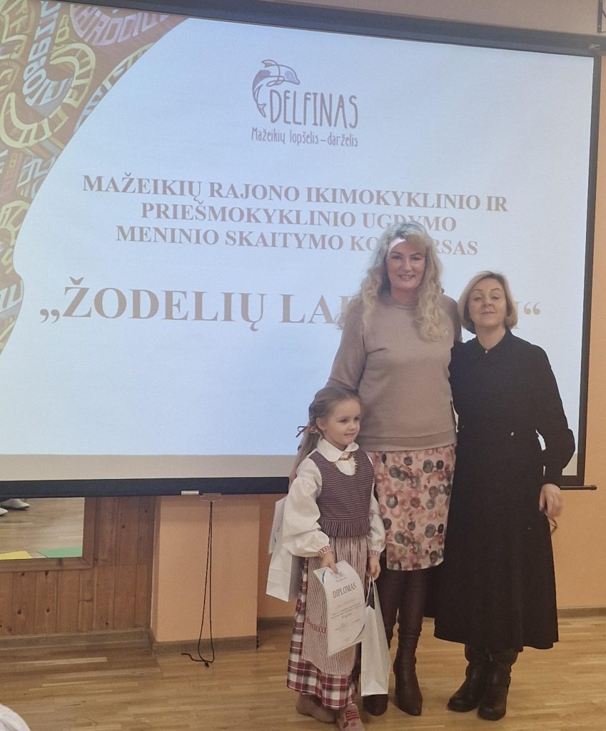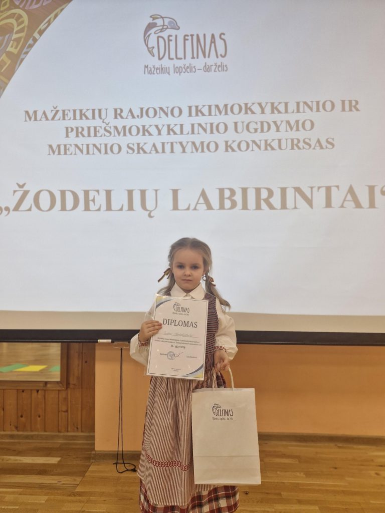Priešmokyklinukė Indrė dalyvavo rajoniniame ikimokyklinio ir priešmokyklinio ugdymo meninio skaitymo konkurse „Žodelių labirintai“ ir užėmė II- ą vietą! Renginys vyko Mažeikių lopšelyje-darželyje „Delfinas“.