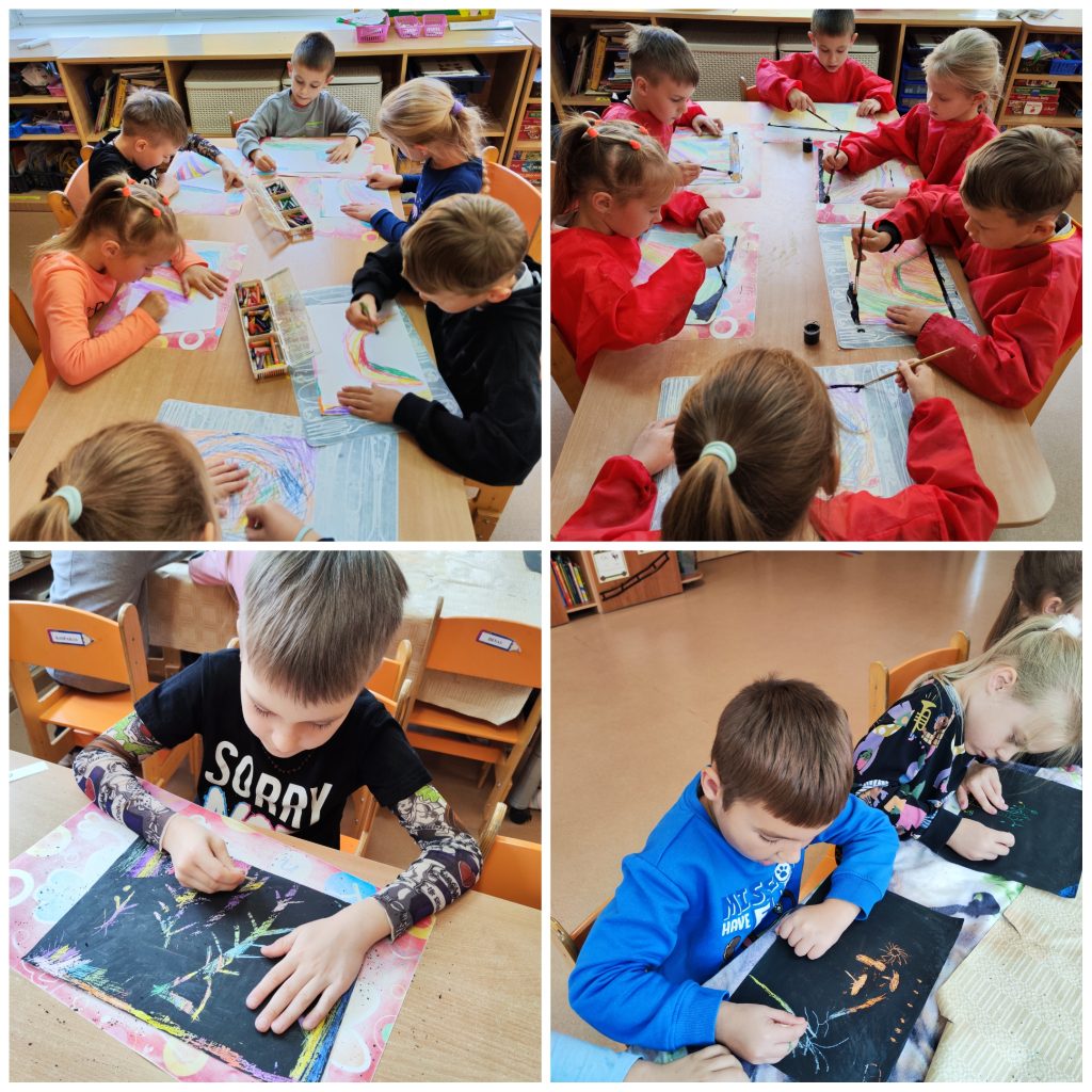 Priešmokyklinukai išbandė grafikos techniką – gratažą, kurio rezultatas nuspėjamas, tačiau savitas ir išskirtinis. Dirbama ant iš anksto vašku, kreida ir tušu padengto popieriaus.