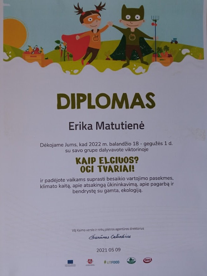 VšĮ Kaimo verslo ir rinkų plėtros agentūra kartu su Lietuvos Respublikos žemės ūkio ministerija pakvietė ikimokyklinio ir priešmokyklinio amžiaus vaikus, pradinio ugdymo moksleivius ir jų pedagogus dalyvauti viktorinoje „Kaip elgiuos? Ogi tvariai!”, skirtoje paaiškinti vaikams ir moksleiviams besaikio vartojimo pasekmes, klimato kaitą, apie atsakingą ūkininkavimą, apie pagarbą ir bendrystę su gamta, ekologiją. Viktorinoje aktyviai dalyvavo ir mūsų įstaigos priešmokyklinukai kartu su mokytoja erika. Užsiėmimų metu vaikai buvo aktyviai skatinami saugoti gamtos resursus, mylėti ir džiuginti žemę. Pagrindinė organizatorių užduotis buvo iš geometrinių figūrų padaryti komandinį darbą, kuriame būtų pavaizduota bent viena daržovė ar vaisius, pavaizduotas bent vienas pieno produktas, pavaizduota saulė ir lietus, pavaizduotas bent vienas vabzdys ar gyvūnas. Užduotis nebuvo lengva, bet visi sėkmingai įvykdė.