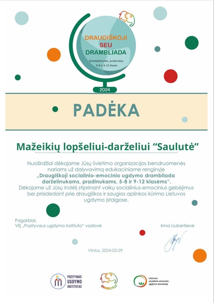 Mūsų 5gr. ir 6 gr. ugdytiniai prisijungė prie „DRAUGIŠKOSIOS SEU DRAMBLIADOS 2024“, kurią organizavo VšĮ „Pozityvaus ugdymo institutas“ ir Lietuvos Socialinio emocinio ugdymo asociacija. Šio renginio tikslas – pabrėžti socialinio ir emocinio ugdymo svarbą. Vaikai atliko įvairias užduotis, kurios lavina 5 pagrindines socialines emocines kompetencijas: savimonę, savitvardą, socialinį sąmoningumą, tarpusavio santykius bei atsakingų sprendimų priėmimą.