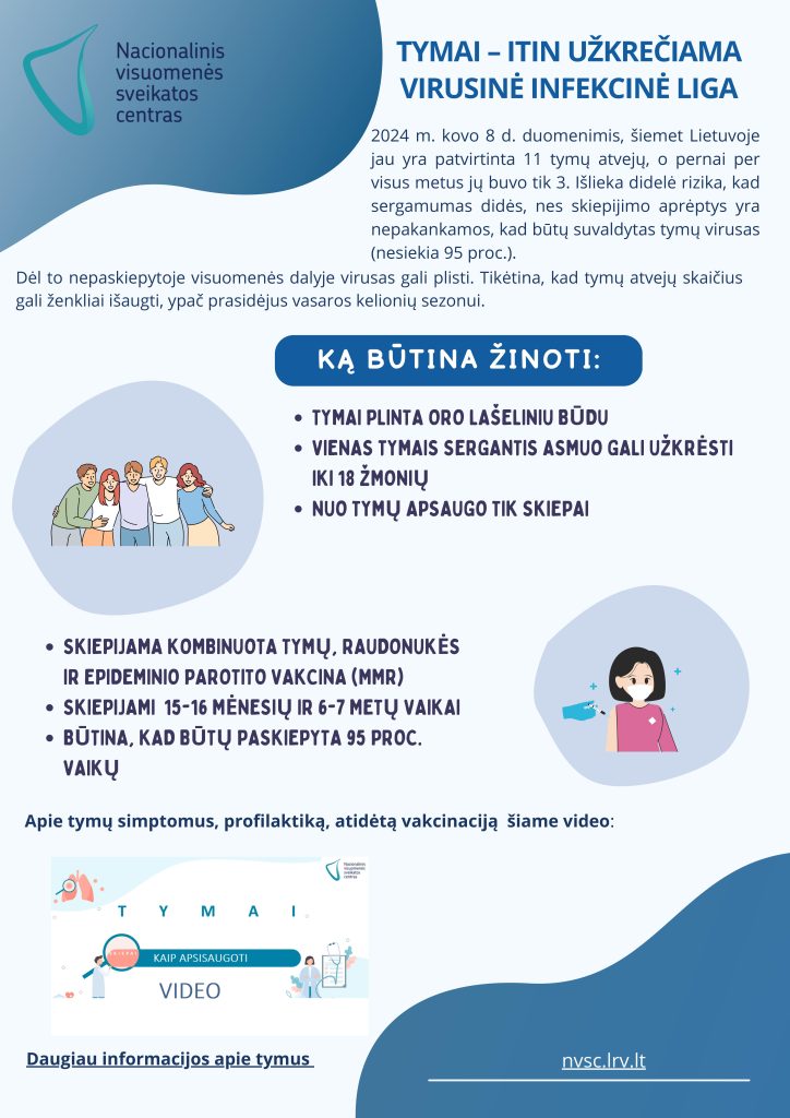 Visuomenės sveikatos specialistė Jurgita Kesminienė dalinasi informaciniais pranešimais apie šiuo metu labiausiai pasireiškiančius susirgimus ugdymo įstaigose. Tymų atvejų mūsų rajone nefiksuota, tai ši informacija tik prevencijai.