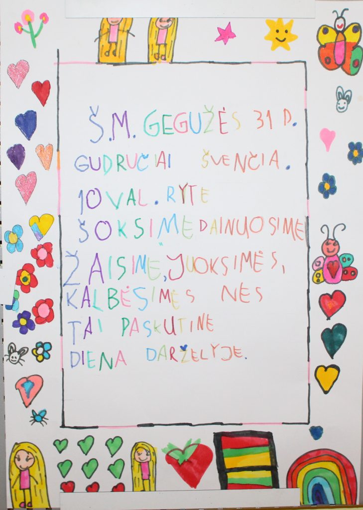 Gegužės 31 dieną į pirmąją klasę palydėjome priešmokyklinės grupės vaikus. Tai – 56 – oji „Saulutės” ugdytinių laida. Ši diena – spalvinga, pilna siurprizų, staigmenų bei juoko kartu.