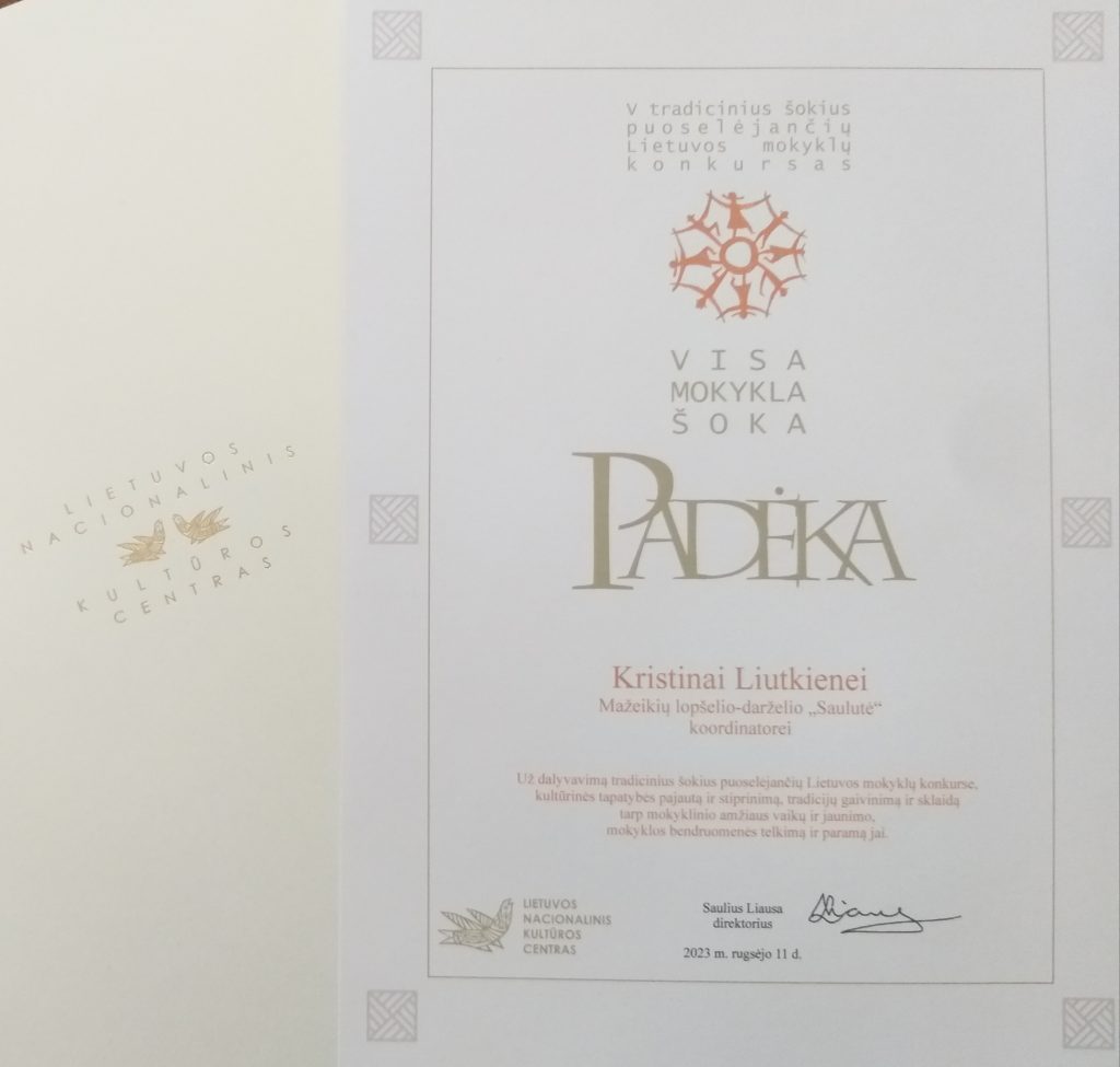 Naujuosius mokslo metus pasitikome su padėka nuo Lietuvos nacionalinio kultūros centro už