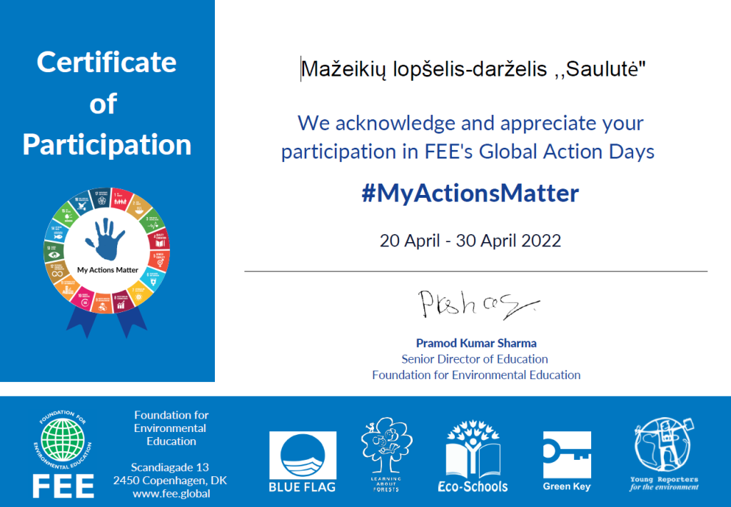 Džiaugiamės, kad ,,Gudručių“ grupės ugdytiniai kartu su mokytoja Erika dalyvavo „Pasaulinių veiksmo dienų 2022“ kampanijos akcijoje. Šių metų Globalinės veiksmo dienos akcijos buvo skirtos skatinti ryšį su gamta, kartu suteikiant dalyviui praktinių įgūdžių ir išteklių stebėti vietos biologinę įvairovę ir suprasti, kaip jie yra #GenerationRestoration dalimi.