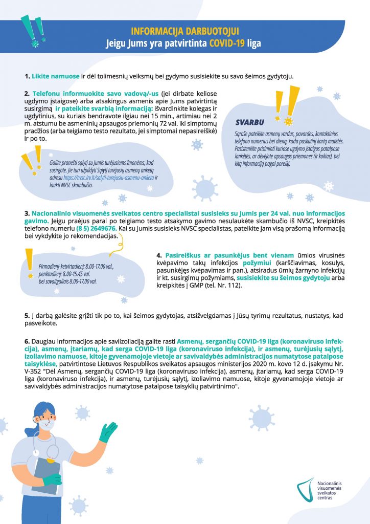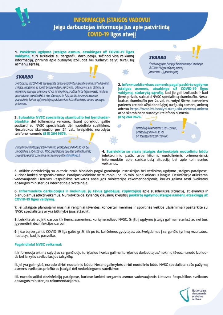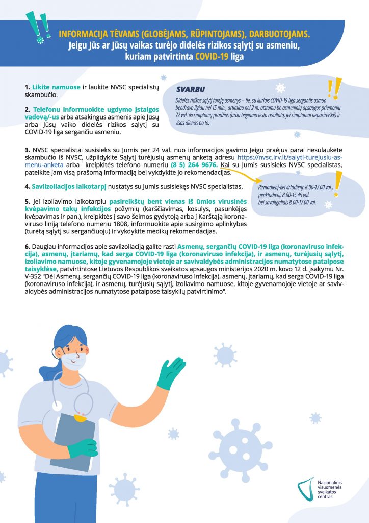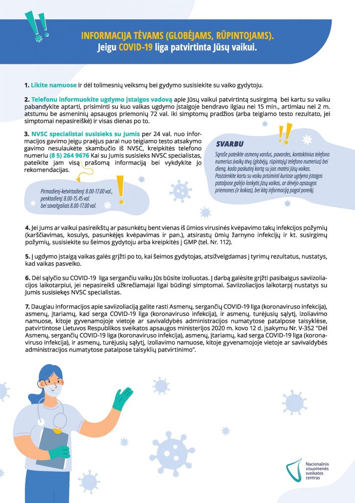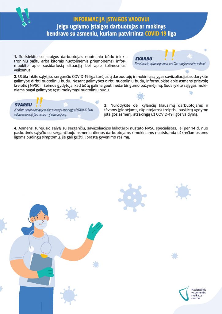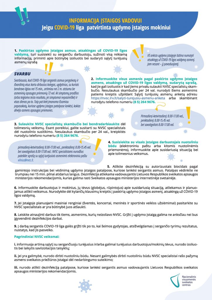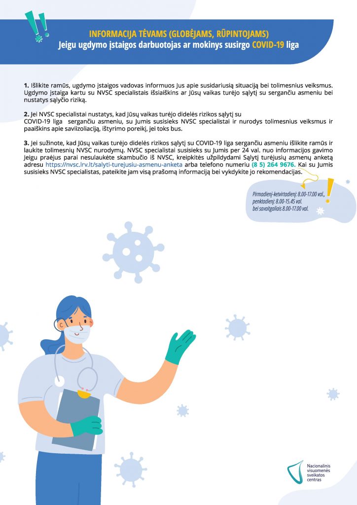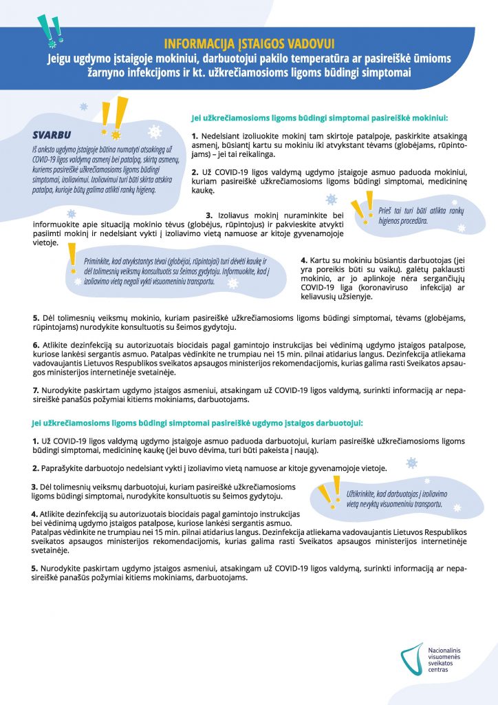 Kaip reikia elgtis, jei ugdymo įstaigos darbuotojas ar mokinys susirgo COVID-19 liga? Ką turi daryti tėveliai? Ką turi daryti ugdymo įstaigos administracija? Visą informaciją rasite Nacionalinio visuomenės sveikatos centro parengtuose algoritmuose.