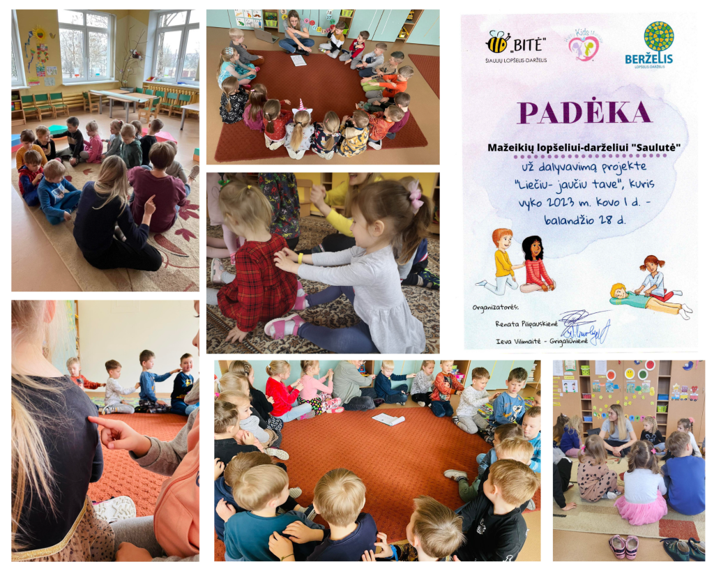 Kovo 1 – balandžio 31 d. mūsų darželio ugdytiniai kartu su socialine pedagoge Erika dalyvavo respublikiniame socialinių – emocinių kompetencijų stiprinimo projekte „Liečiu – jaučiu Tave“ (pagal „Happy Kids Massage“ metodiką).  „Happy Kids Massage“ metodika ‒ viena plačiausiai šiuo metu Nyderlanduose ir Belgijoje taikomų „abipusio“ vaikų masažo formų. Šio projekto metu vaikai mokėsi nusiraminimo būdų, savimasažo bei atliko masažo elementus ant draugo nugaros. Ši veikla teigiamai veikia grupės savijautą, skatina vaikus bendrauti, bendradarbiauti, mokomasi atsipalaiduoti ir susikaupti, įvardinti savijautą. Projektą organizavo Šiaulių lopšeliai-darželiai „Bitė” ir „Berželis”.