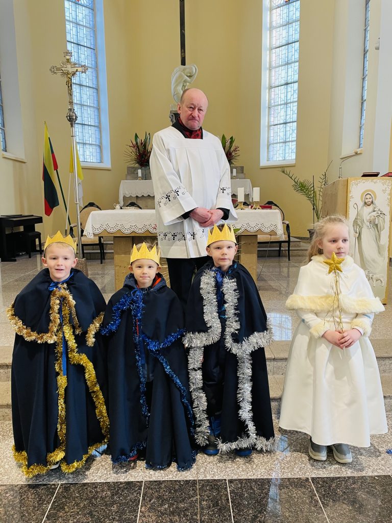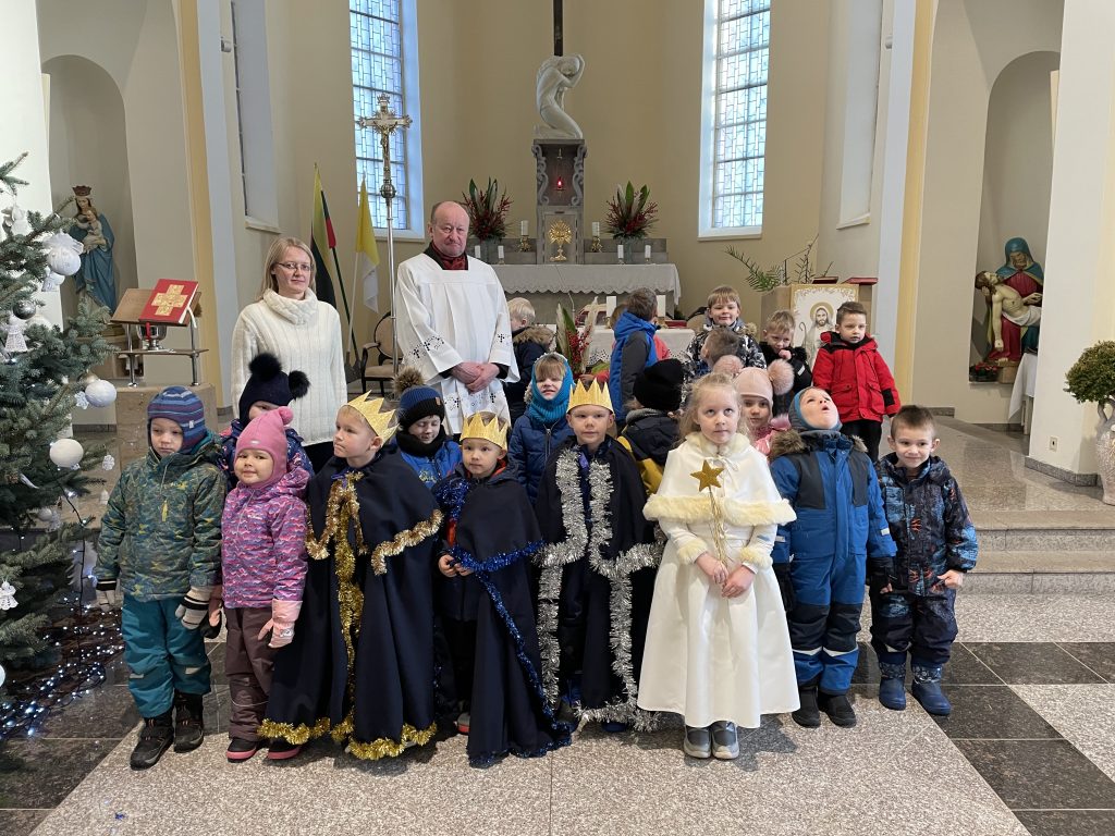 Nutilus šventiniam šurmuliui, sausio 6 dieną mūsų darželį aplankė Trys karaliai: Kasparas, Baltazaras ir Merkelis. Trys karaliai visiems linkėjo, kad metai būtų geri ir sėkmingi, o vyresniųjų grupių vaikus pakvietė kartu vykti į Mažeikių Švč. Jėzaus Širdies bažnyčią pagiedoti Kalėdinių giesmių. Dėkojame vikarui Antanui už šiltą sutikimą ir įdomų pasakojimą.