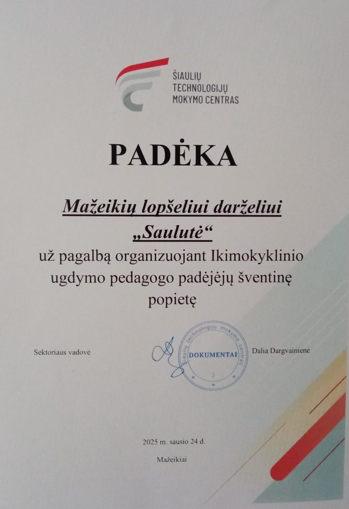 Tęsiasi bendryste su Šiaulių TMC Sveikatos priežiūros ir socialinės gerovės skyriumi Mažeikiuose. Sausio 24 dieną mūsų įstaigos mažieji dainininkai kartu su mokytojomis dalyvavo ikimokyklinio ugdymo pedagogo padėjėjo mokinių išleistuvėse.