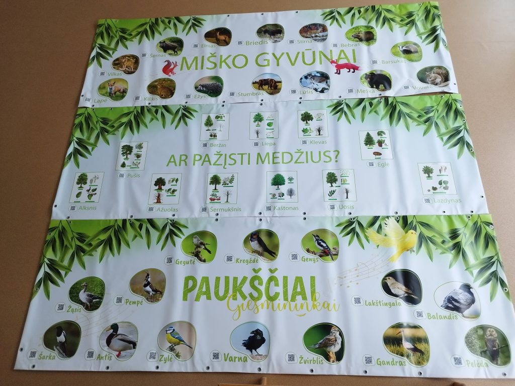 Įgyvendinant Mažeikių rajono savivaldybės aplinkos apsaugos rėmimo specialiosios programos lėšomis finansuojamą visuomenės aplinkosauginio švietimo projektą, sukurti ir pagaminti 3 edukaciniai tentai su QR kodais gamtosaugine tema: „Ar pažįsti medžius?‘‘ „ Miško gyvūnai“, „Paukščiai giesmininkai“. Kuriama erdvė šių tentų pristatymui.
