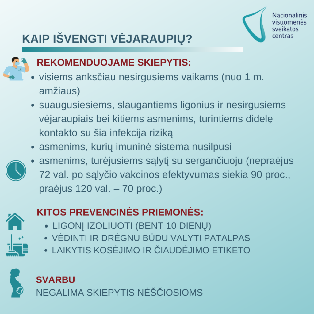 Nacionalinio visuomenės sveikatos centro prie Sveikatos apsaugos ministerijos Telšių departamentas informuoja, kad auga sergamumas vėjaraupiais visoje Lietuvoje, taip pat ir Telšių apskrityje. 2025 m. per pirmus 2 mėnesius (sausio ir vasario mėn.) Telšių apskrityje buvo užregistruoti 234 vėjaraupių atvejai (2024 m. – 108 atvejai). Mažeikių r. sav. užregistruoti 47 susirgimai.